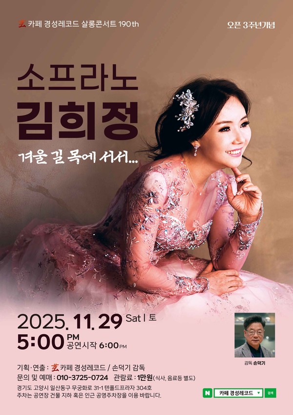 카페 ‘경성레코드’(감독 손덕기)가 오픈 3주년을 기념해 준비한 제190회 살롱콘서트가 오는 11월 29일(토) 오후 5시 경기 고양시 일산동구 무궁화로 텐폴드프라자에서 열린다.