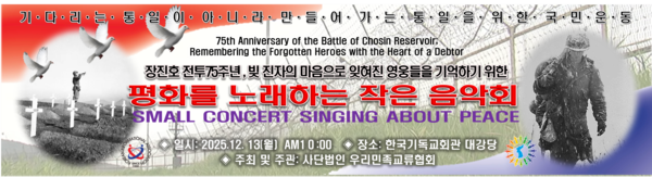 우리민족교류협회 송기학 이사장은 “이번 음악회가 장진호 전투 영웅들의 희생정신을 새롭게 조명하고, 평화의 가치를 되새기는 뜻깊은 시간이 되길 바란다”며 “특히 한국 교회가 기억의 사명을 이어받아 미래 세대에 올바른 역사 의식을 전하는 계기가 되기를 기대한다”고 말했다.